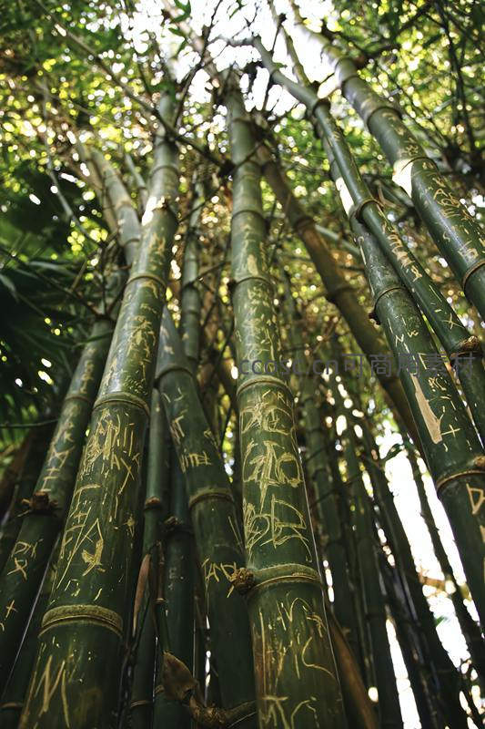 仰拍视角下,竹竿上布满手刻文字与符号,记录着过往岁月的痕迹,在光影中诉说人文与自然的交融故事。