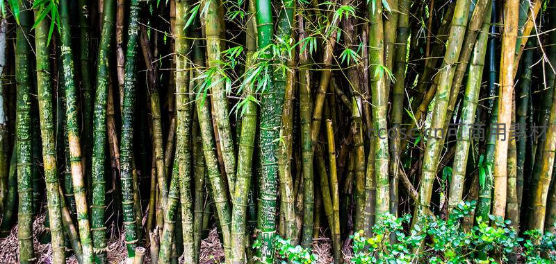 茂密的翠绿竹林,竹竿挺拔,叶片青翠欲滴,地面铺满落叶,营造出静谧而充满生命力的自然氛围。