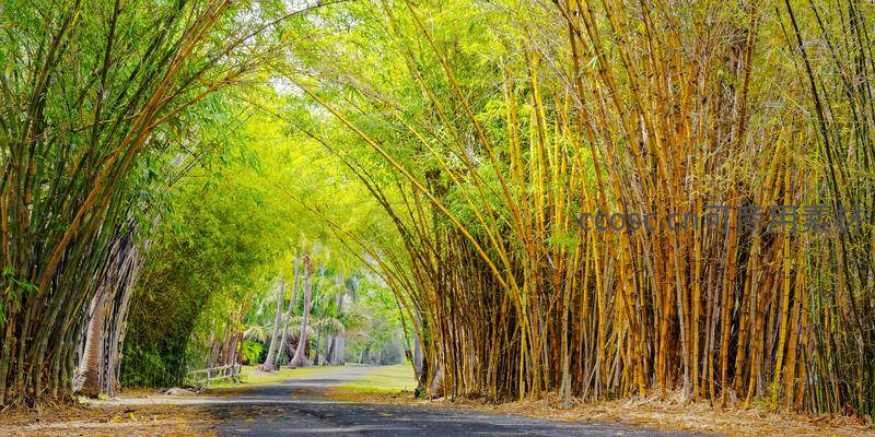 两侧竹林拱起形成天然长廊,阳光穿透枝叶洒在柏油路上,光影交错,宛如一幅宁静优美的自然画卷。