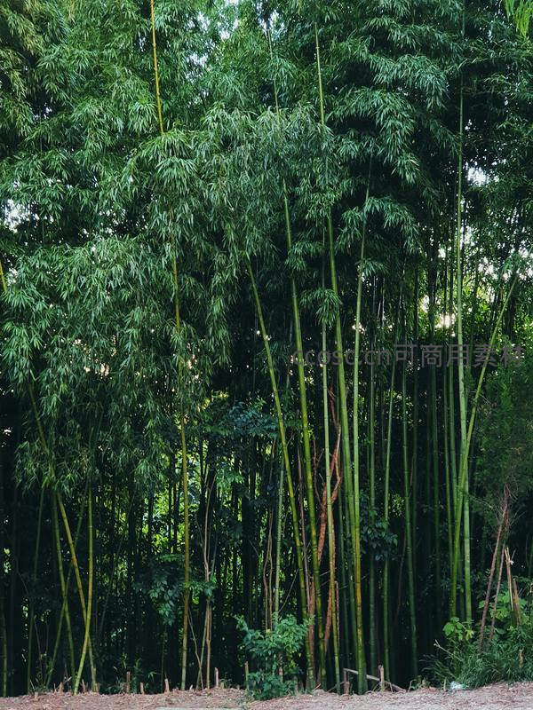 高耸挺拔的竹子密集生长,枝叶繁茂,在阳光下形成斑驳光影,营造出一片静谧而充满生命力的自然景观。