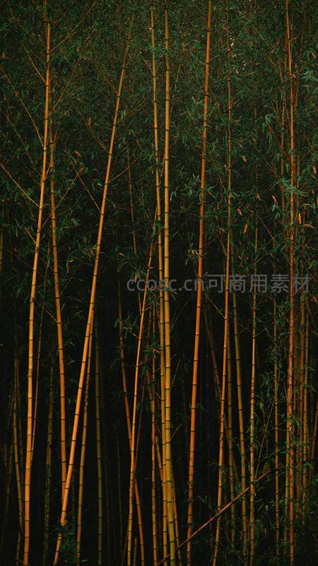 夕阳余晖为竹林披上温暖金纱,深色背景衬托出竹竿的挺拔与柔美,营造出诗意朦胧的黄昏意境。