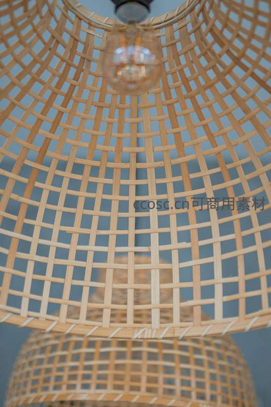 竹编灯罩特写,温暖灯光透出自然纹理