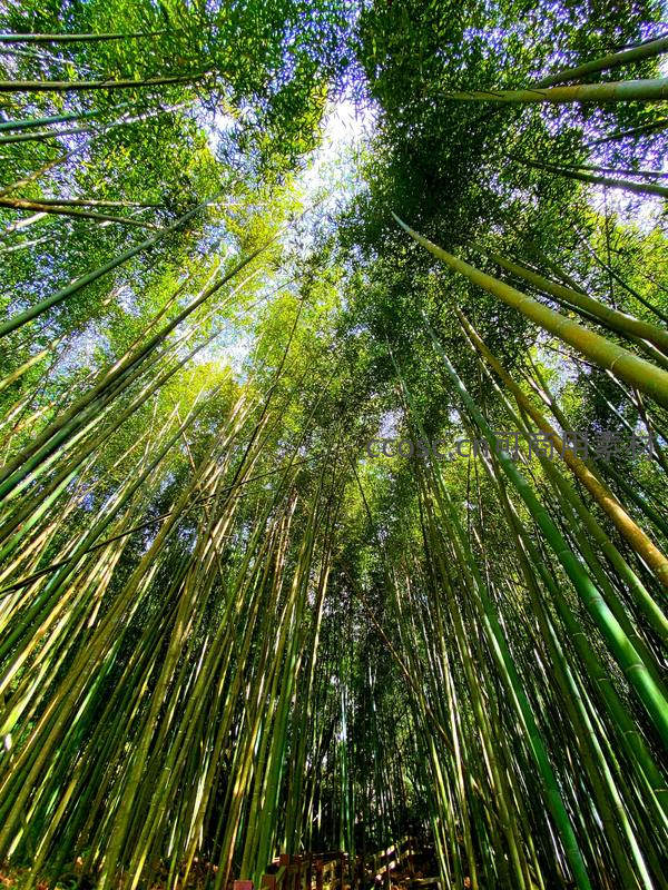 从地面仰望茂密竹林,修长的竹竿与浓密的绿叶交织,阳光穿透缝隙洒下斑驳光影,充满自然生命力。