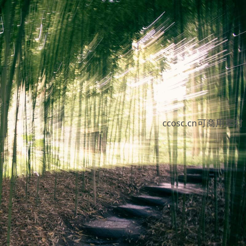 运用长曝光技术拍摄竹林小径,移动的光点化作流动的光轨,模糊了竹影,营造出梦幻、神秘且充满动感的超现实意境。