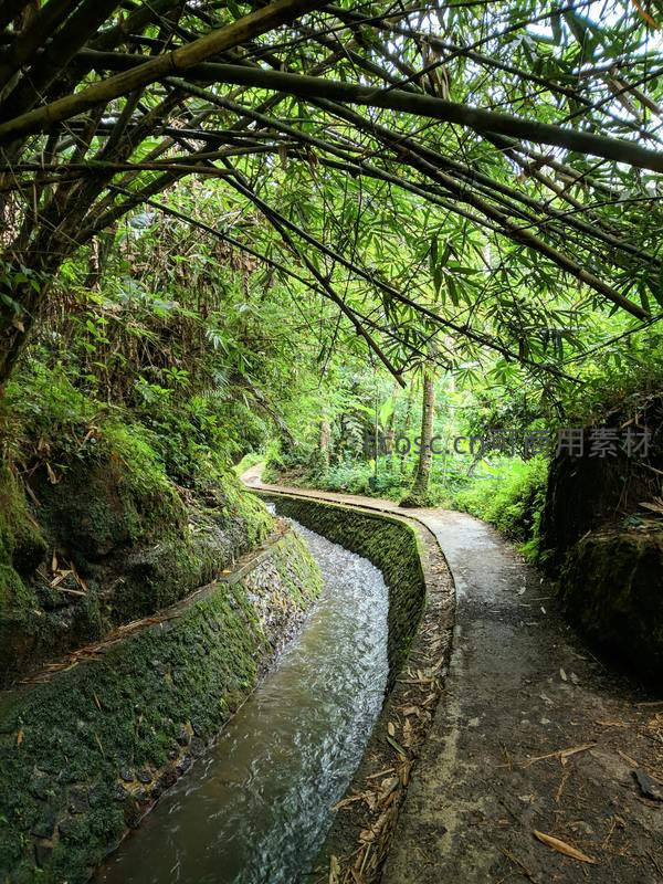 清澈溪水沿青苔覆盖的石渠流淌,旁有泥土小道蜿蜒,四周被浓密竹林环绕,构成一幅清凉湿润、充满野趣的山林画卷。