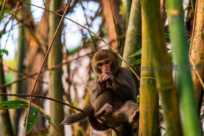 小猴子坐在竹枝上专注吃着食物,圆溜溜的眼睛和毛茸茸的脸颊充满童趣,生动捕捉了它在自然环境中无忧无虑的快乐时光。