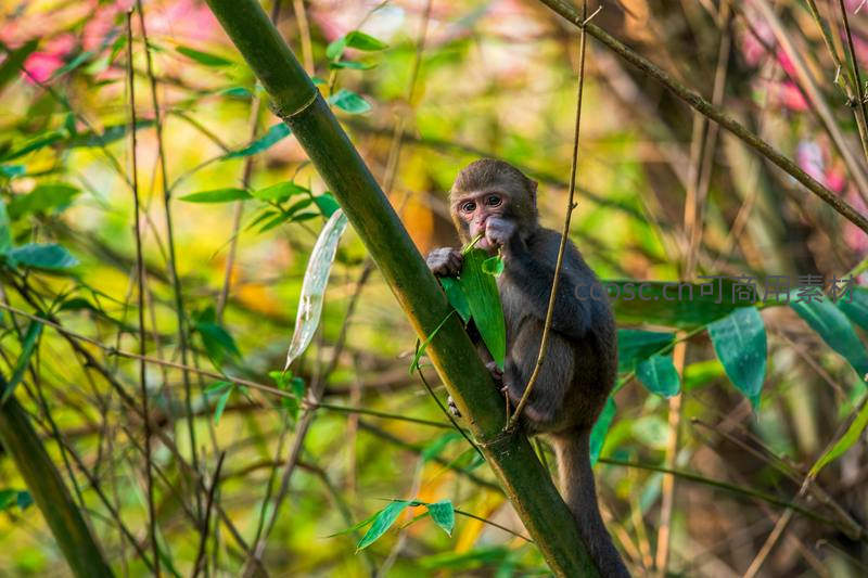 小猴子紧抱竹竿,津津有味地咀嚼着鲜嫩竹叶,背景色彩斑斓,突显其活泼天性与自然环境的和谐共生,画面温馨治愈。