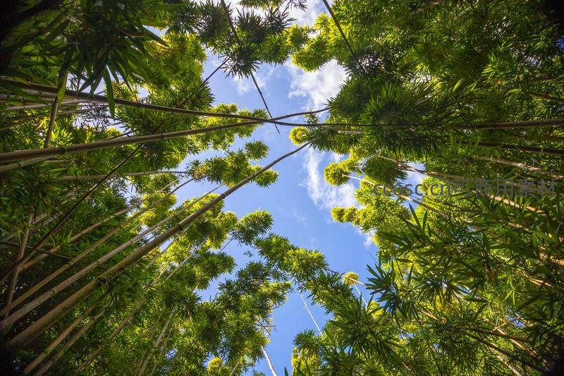 从低角度仰望茂密竹林,翠绿竹叶与湛蓝天空交相辉映,阳光穿透缝隙洒下斑驳光影,意境悠远。