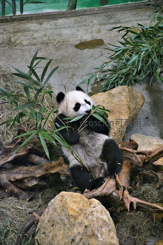 一只憨态可掬的大熊猫悠闲地坐在岩石和枯木间,抱着新鲜的竹叶大快朵颐,黑白分明的毛色与翠绿竹叶形成鲜明对比,尽显其可爱本性。