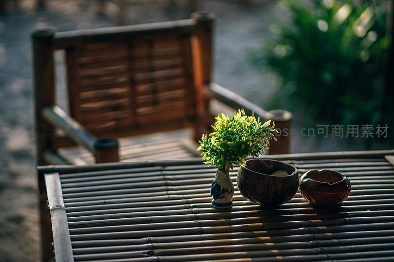 阳光洒在竹制桌面上,一株小绿植与两个陶碗静静摆放,后方木椅模糊,构成一幅宁静惬意的午后生活画面。