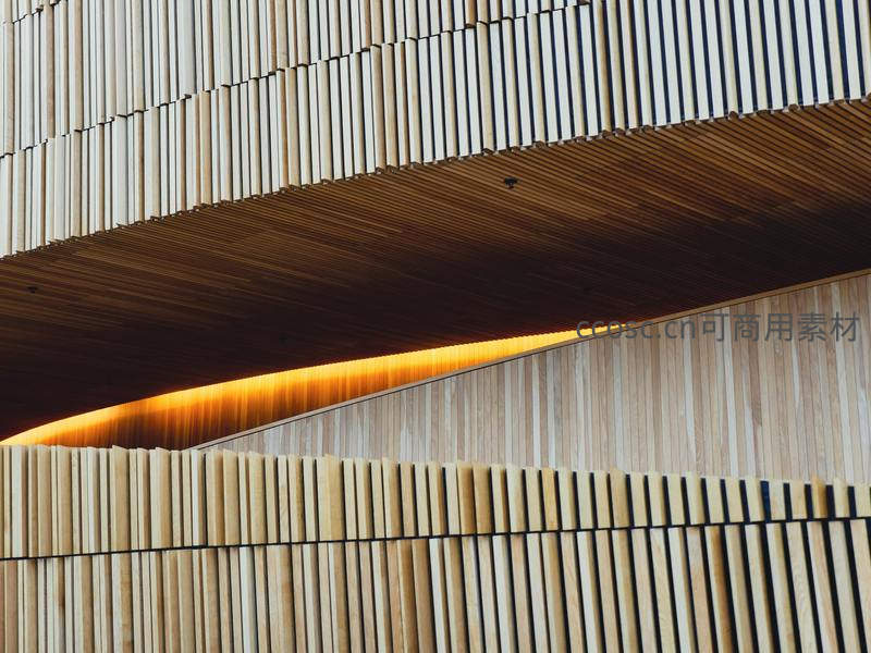 现代建筑内部,流畅的木质曲线结构与温暖的嵌入式灯光相得益彰,展现出精妙的设计感与舒适的视觉体验。