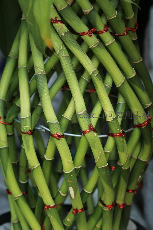 多根富贵竹用红绳巧妙编织成塔状造型,寓意吉祥如意,常用于家居装饰或节庆场合增添喜气氛围。
