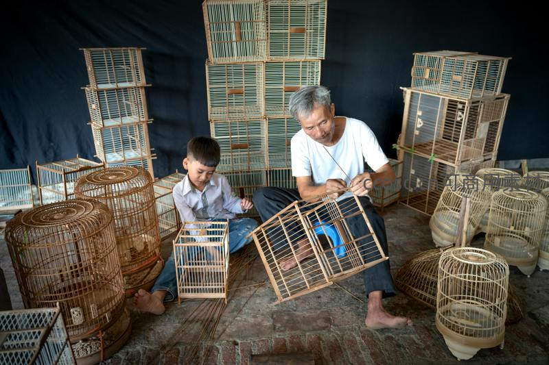 一位老人与小男孩在室内专注地制作竹制鸟笼,周围堆满各式成品,体现传统手工艺的代际传承与亲情互动。