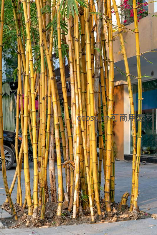 一丛金黄色竹子栽种于城市人行道旁,与现代建筑相映成趣,为钢筋水泥的都市增添一抹自然活力与视觉亮点。