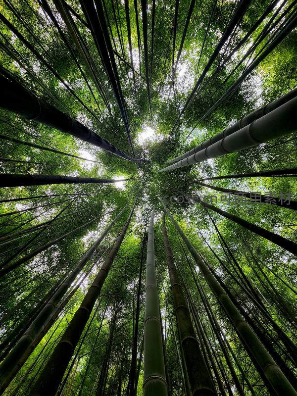 从低角度仰视茂密竹林,修长竹竿直指天空,翠绿叶片在阳光下透出柔和光芒,营造出宁静致远的自然意境。