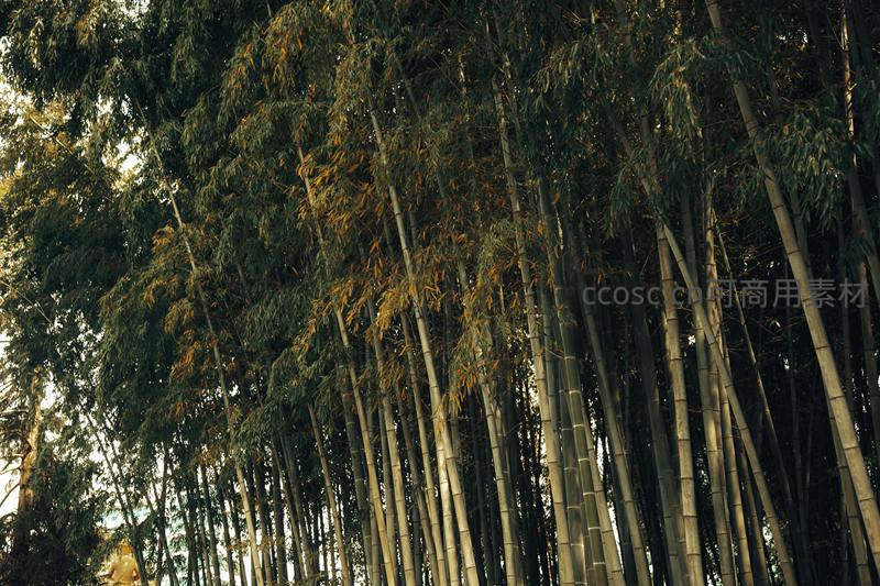 傍晚时分,暖阳斜照竹林,光线穿透枝叶,在竹竿上投下斑驳金影,为整片竹林披上温柔诗意的暮色外衣。