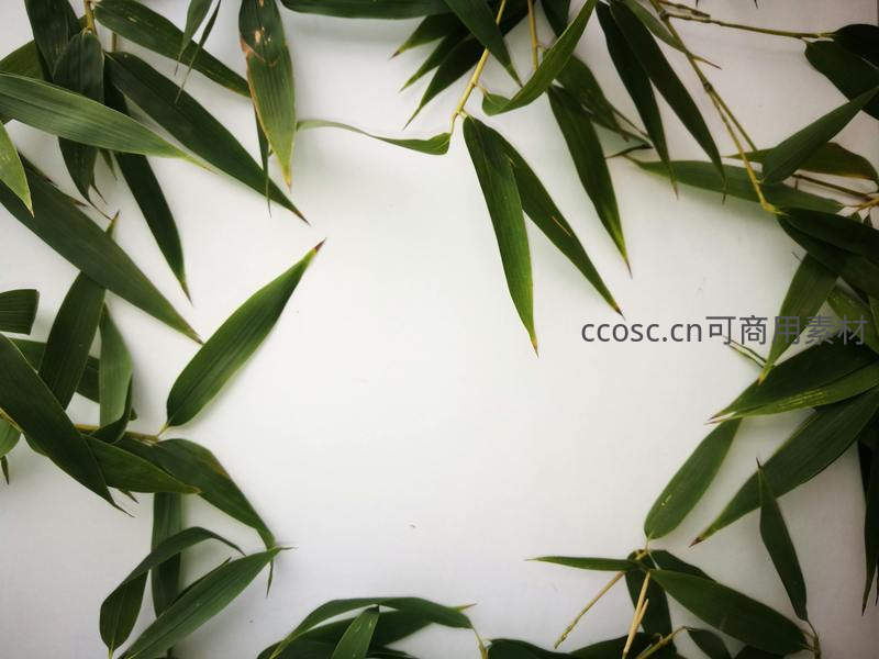 新鲜翠绿的竹叶在纯白背景上巧妙排列成环形边框,中心留白,风格极简清新,适合作为设计或文案的视觉元素。