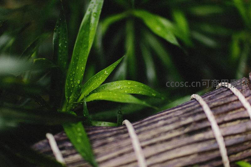 雨后竹叶上缀满剔透露珠,晶莹欲滴,前景是绑有麻绳的木质结构,画面充满湿润清新的自然气息与细腻的生命质感。