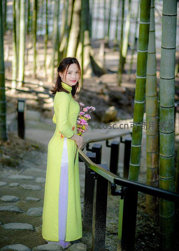 一位身着明黄色传统长裙的女子手捧鲜花立于竹林小径,回眸浅笑,背景竹影婆娑,尽显东方古典韵味与温柔气质。