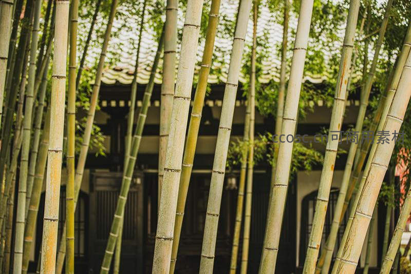 高耸的竹竿后隐约可见传统中式建筑的飞檐翘角,阳光透过竹叶洒下斑驳光影,充满古典诗意与自然和谐。