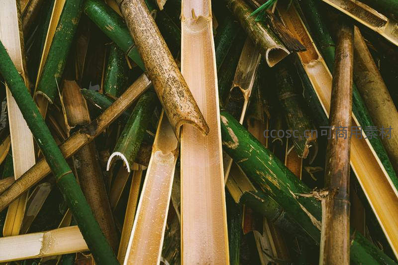 一堆切割后的竹竿紧密堆叠,绿黄相间的竹节和粗糙的切面展现出天然材质的原始美感与实用价值。