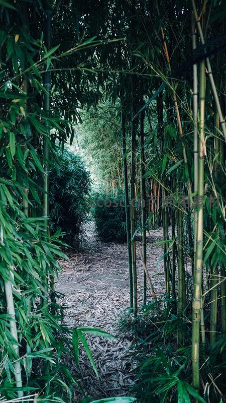一条铺满落叶的小径在浓密竹林间延伸,两侧翠绿竹叶低垂,前方光线微明,引人遐想这隐秘通道尽头的风景。