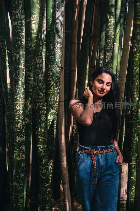 女子倚靠刻满涂鸦的竹林,微笑恬静