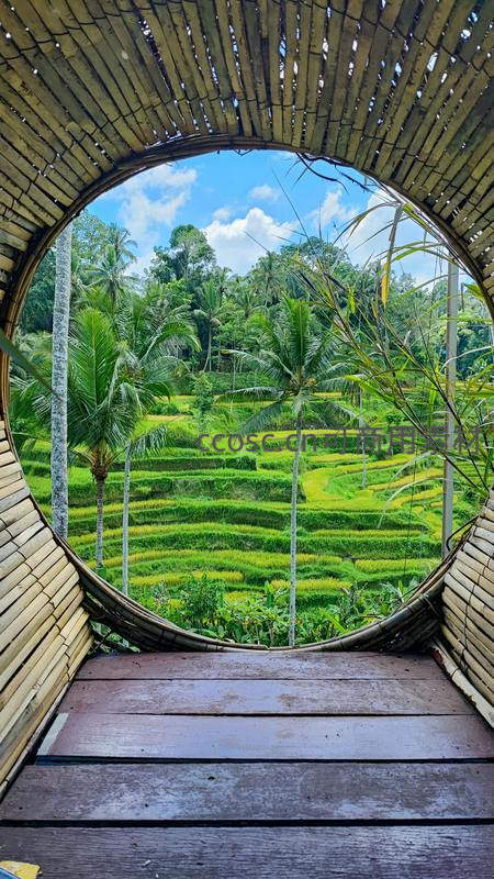 透过天然竹制拱门,可俯瞰层层叠叠的翠绿梯田与茂密椰林,蓝天白云下尽显热带田园的宁静与壮美。