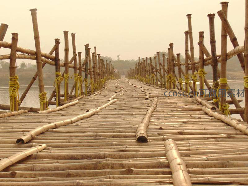一座由粗壮竹竿搭建而成的长桥,用黄色绳索固定,横跨于平静河面之上,展现原始而质朴的乡村风情。