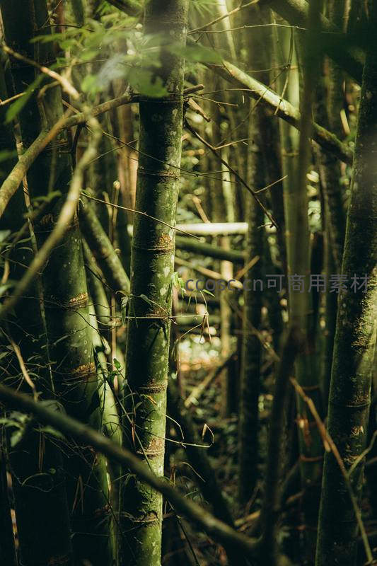 浓密竹林中,高耸的竹竿与交错的枝叶形成复杂光影,营造出幽深、静谧且略带神秘的原始森林氛围。