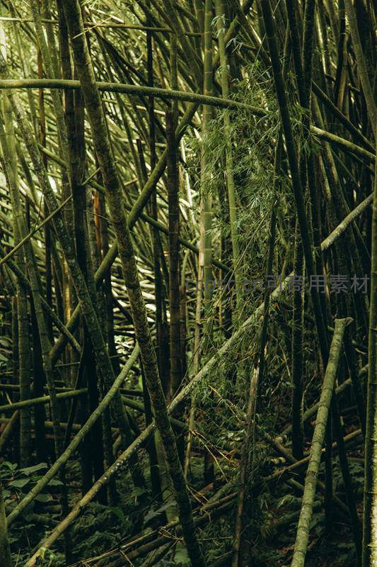 密集的竹竿与枝叶交织成天然屏障,地面散落枯枝落叶,展现出原始森林的野性美与生态系统的丰富层次感。