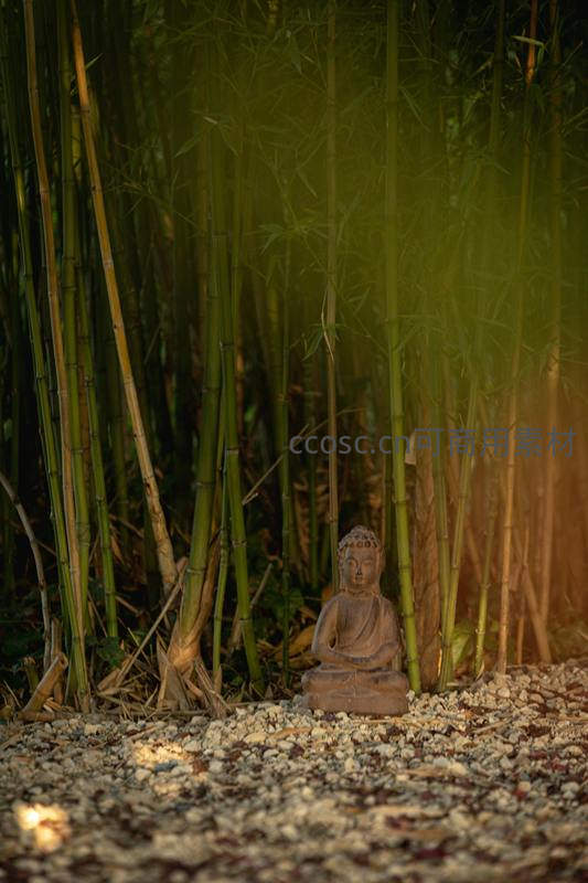 一尊古朴的佛像静坐于竹林深处的碎石地上,温暖的夕阳光线穿透竹影,营造出充满禅意与宁静祥和的东方庭院意境。