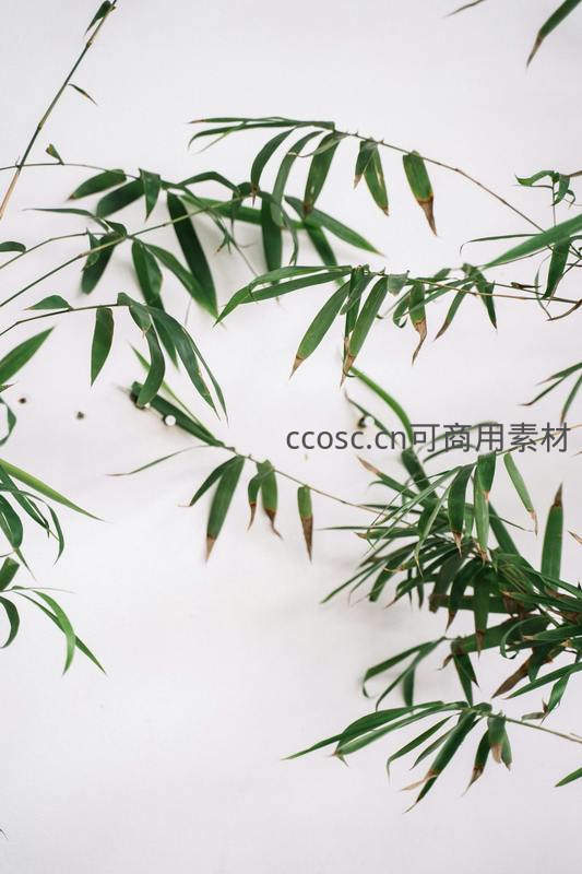 对竹叶进行微距特写拍摄,绿叶在纯白背景下显得格外清新,叶片边缘略带枯黄,展现出自然生长的细节与简约的艺术美感。