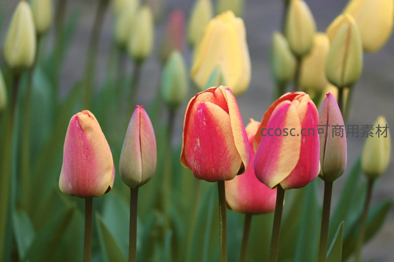 红黄相间的郁金香花蕾在绿叶丛中静待绽放,色彩过渡柔和,展现出生命萌动的宁静与期待之美。