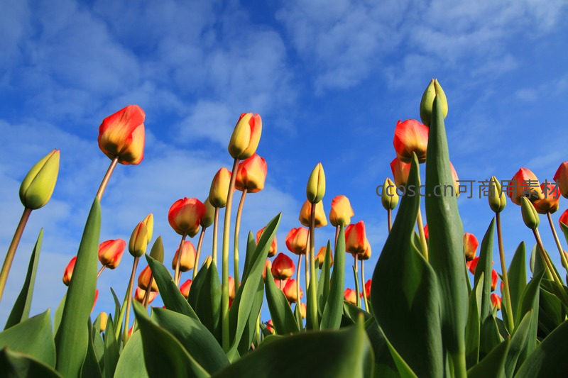 从低角度仰望,橙黄色郁金香迎着蔚蓝天空挺立,绿叶如剑,构成一幅充满生命力与空间感的春日画卷。