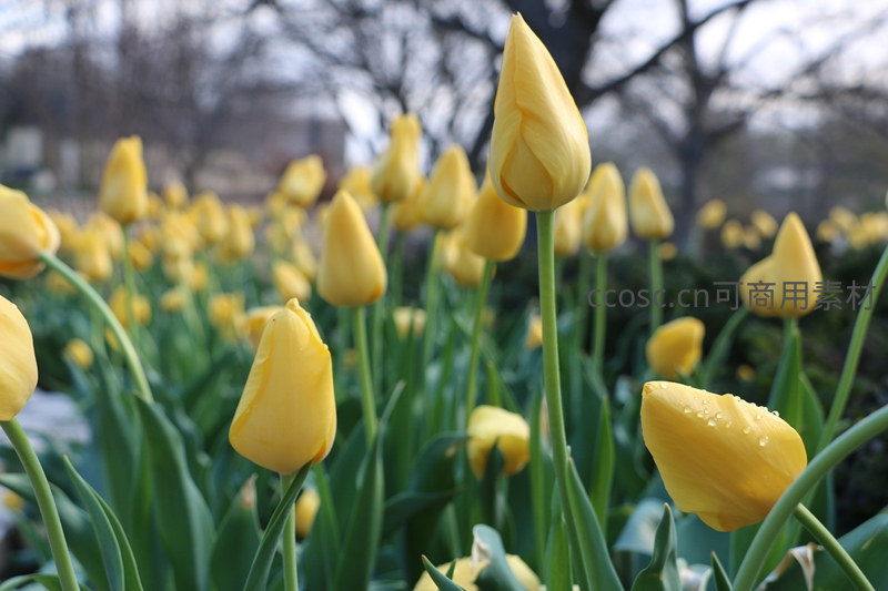 晶莹水珠轻挂于金黄郁金香花瓣之上,背景是朦胧的树影,营造出清晨花园宁静、湿润而温暖的氛围。