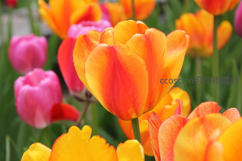 一朵鲜艳的橙红色郁金香在阳光下完全绽放,花瓣边缘泛着柔和光泽,背景中其他花朵虚化,突显其热情洋溢的生命力。
