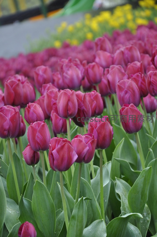 大片紫红色郁金香在阳光下盛放,绿叶衬托,背景模糊黄花点缀,展现春日花园的浪漫与活力。