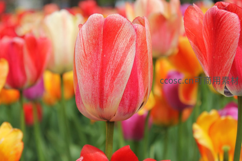 镜头聚焦于一朵粉白相间的郁金香,背景是模糊的多彩花海,营造出梦幻而富有层次感的视觉效果。