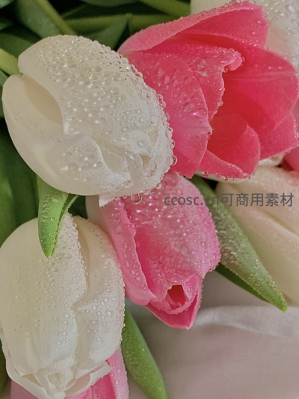 白色与粉色郁金香花瓣上密布细小水珠,在柔和光线下闪烁如珍珠,尽显花朵的纯净与娇嫩之美。