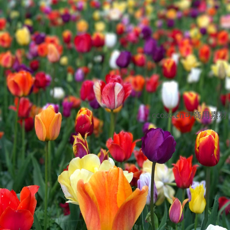 多种颜色郁金香在花丛中争奇斗艳,从深紫到明黄,从鲜红到纯白,层次丰富,色彩饱和,展现大自然的慷慨与绚烂。