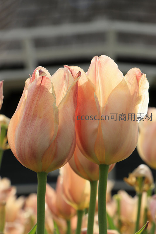 阳光透过薄如蝉翼的淡粉郁金香花瓣,透出温暖的光泽,花瓣边缘微微卷曲,尽显春日的温柔与生机。
