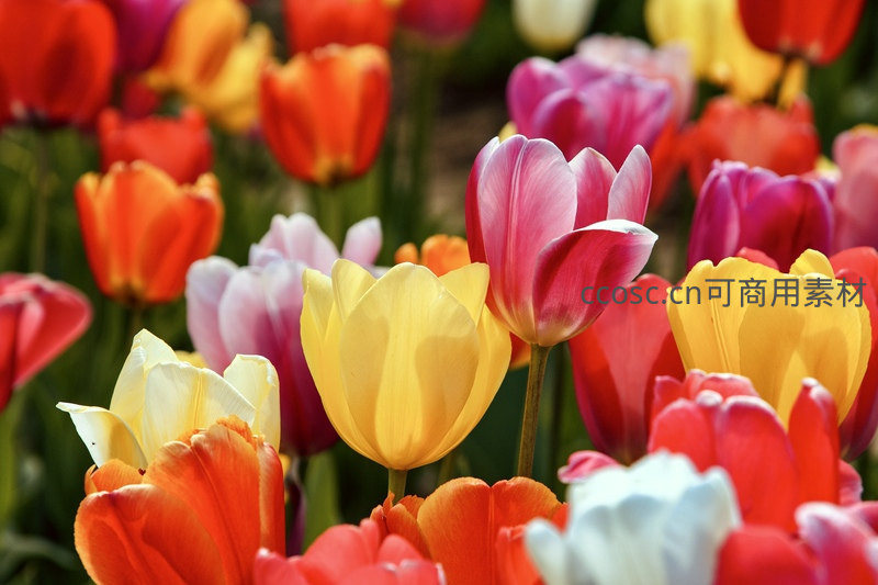 阳光下,各色郁金香竞相开放,红、黄、粉、白交织成一片绚烂的花海,绿叶衬托,充满春日活力与自然之美。
