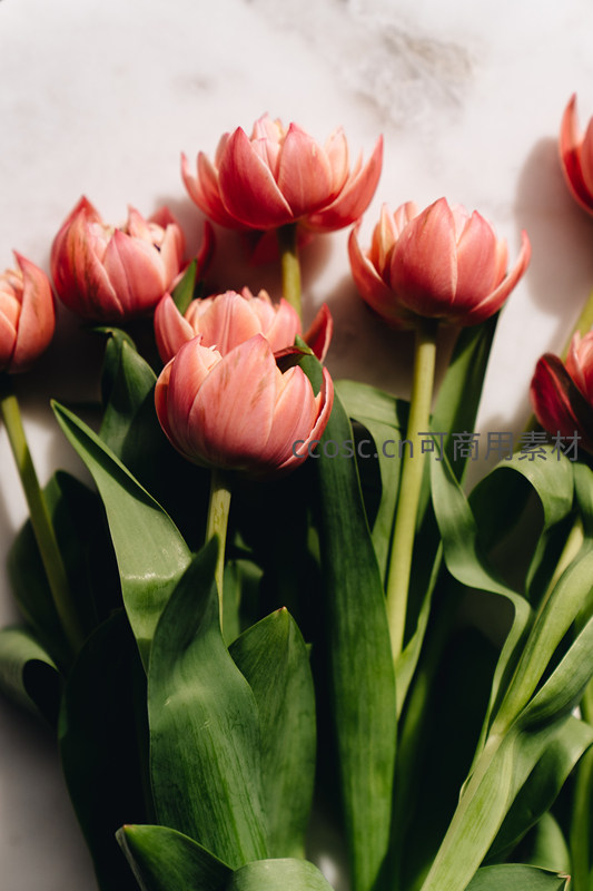 几支娇嫩的粉色郁金香被精心摆放在洁白的大理石台面上,光影交错,绿叶相衬,展现出一种简约而不失高级感的艺术美感。