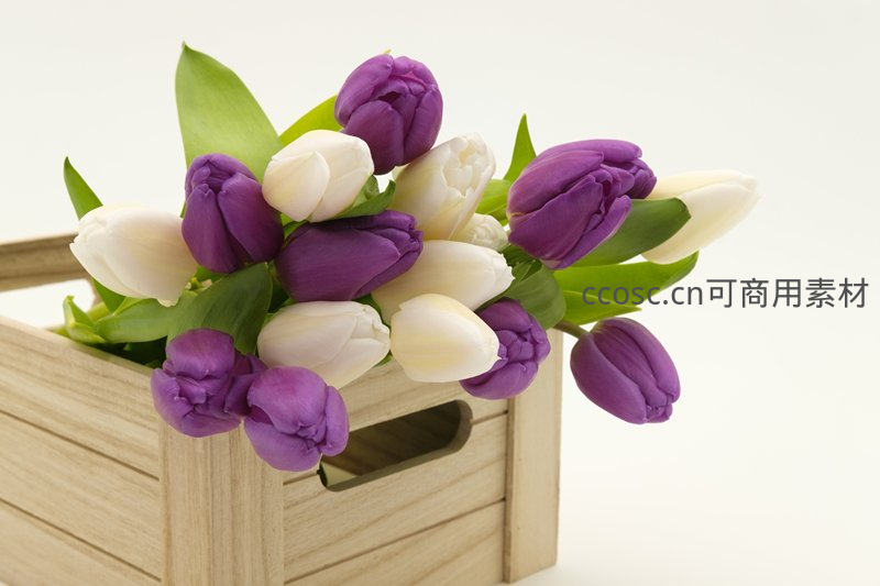 紫色与白色的郁金香巧妙搭配,盛放在质朴的木质花篮里,简洁的背景凸显花朵的清新与活力,是充满创意的静物摄影作品。