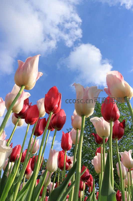 从低角度仰望高耸的郁金香花茎,粉白与深红花朵在蔚蓝天空和朵朵白云映衬下显得格外清新明亮。