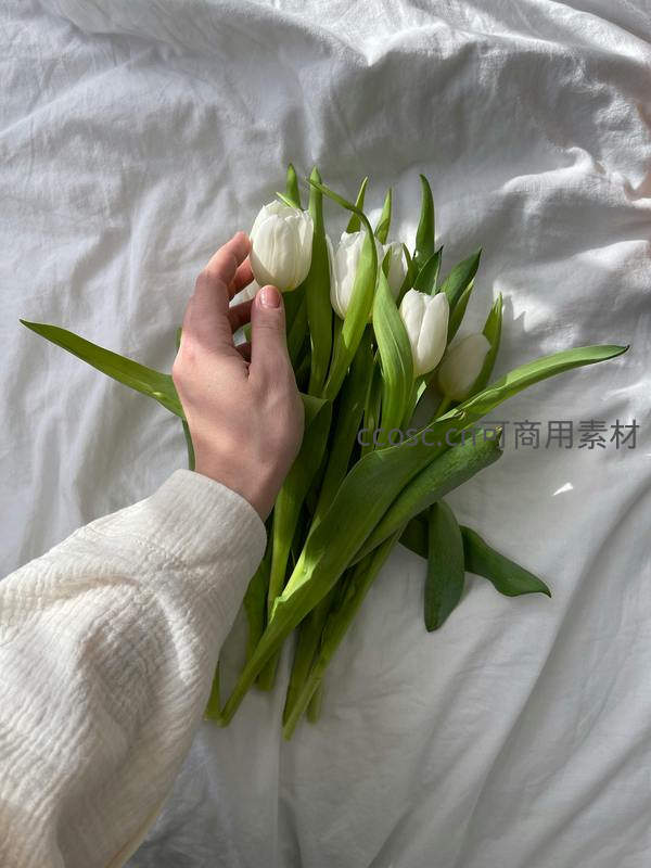 一只纤细的手轻握一束含苞待放的白色郁金香,置于褶皱的白色床单之上,画面纯净柔和,充满生活仪式感。
