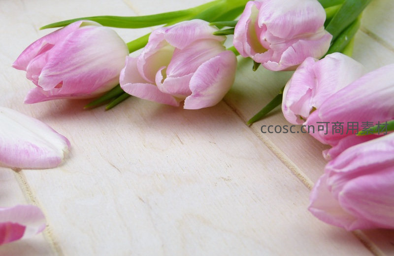 几支淡粉色郁金香随意摆放在浅色木质桌面上,花瓣轻柔,背景简洁,营造出宁静、温馨且富有生活气息的居家场景。