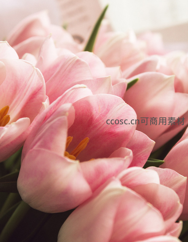 近距离捕捉粉嫩郁金香的柔美花瓣与橙色花蕊,背景虚化,光线温柔,凸显花朵的细腻质感与春日的浪漫气息。