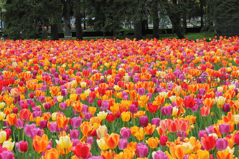 广袤的郁金香花田如彩色地毯般铺展,红、橙、粉、紫、黄交织,远处松树环绕,构成一幅壮丽而梦幻的春日画卷。